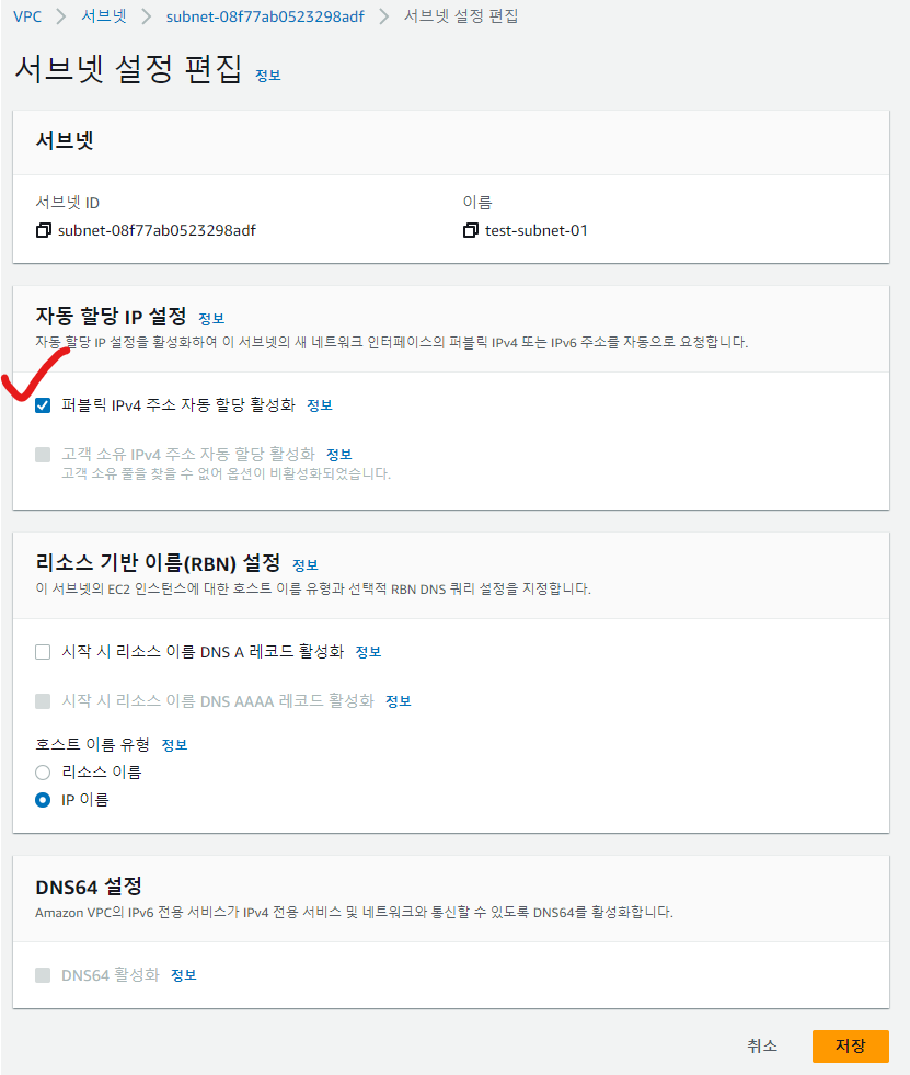 만약 이를 설정 안하면 해당 VPC로 자동 오토스케일링된 EC2를 만들면 public IPv4 할당이 안되어서