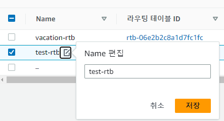 라우팅 테이블 중 이름이 없는 것이 있는데 VPC 이름을 확인해보면 우리가 아까 만든 test-vpc가 있는 것을 확인할 수 있다