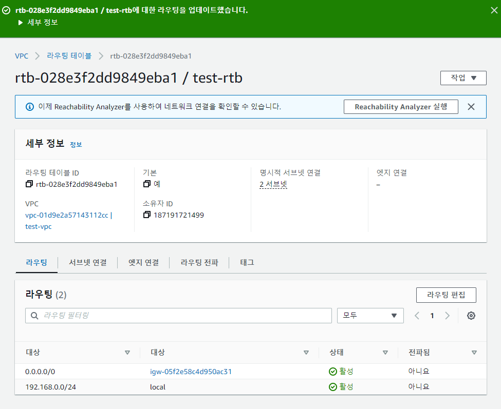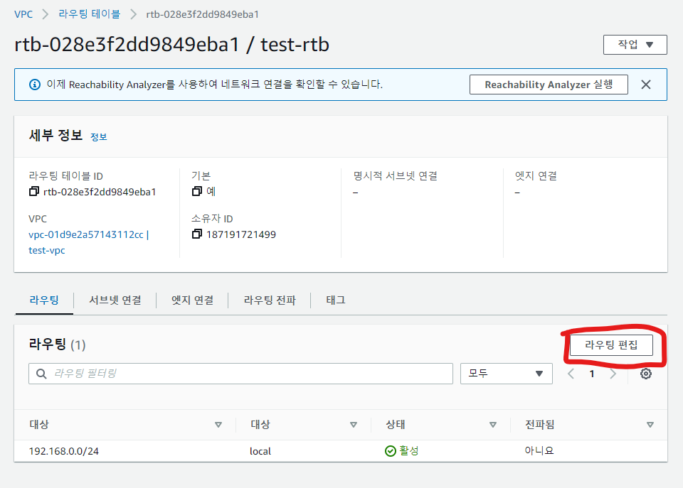 우리가 만들어준 인터넷 게이트웨이 (test-igw)를 클릭 후 "변경사항 저장 클릭"