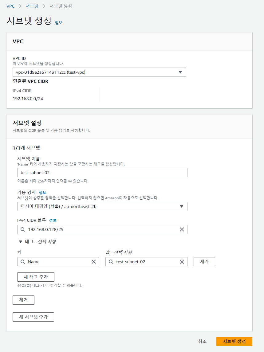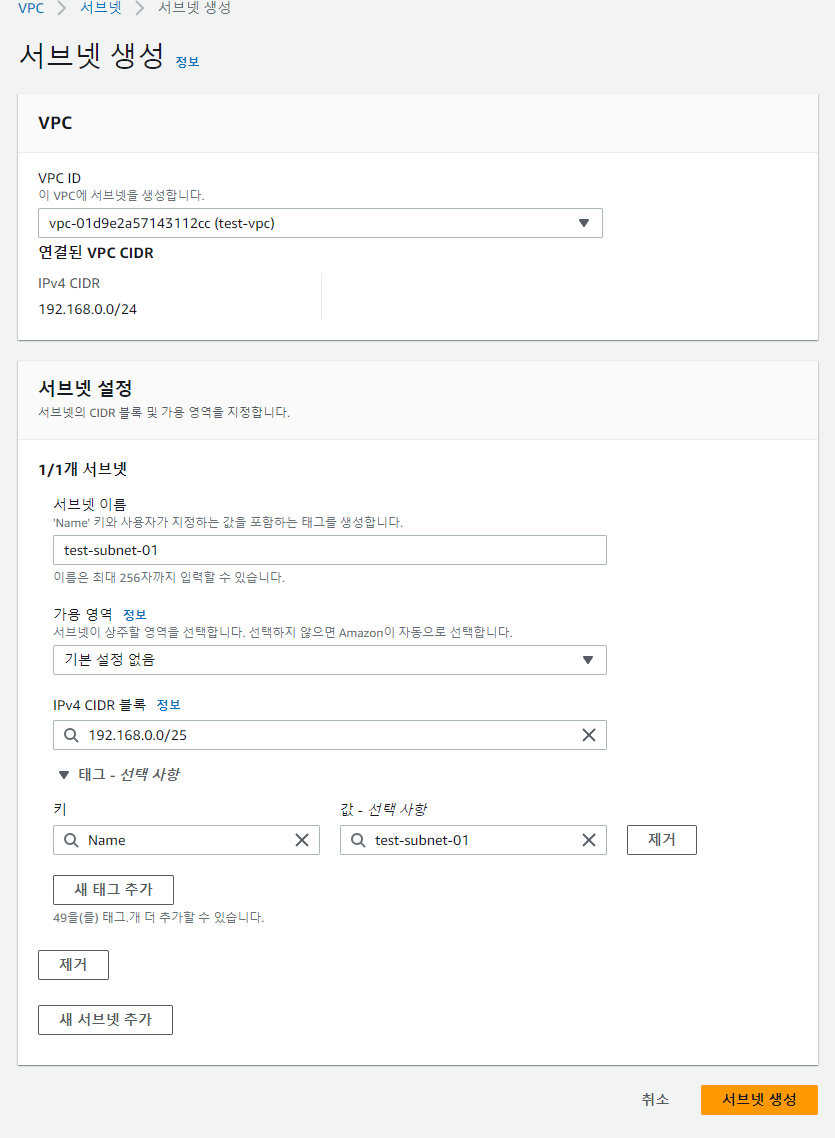 VPC => 서브넷 페이지로 가서 "서브넷 생성" 클릭