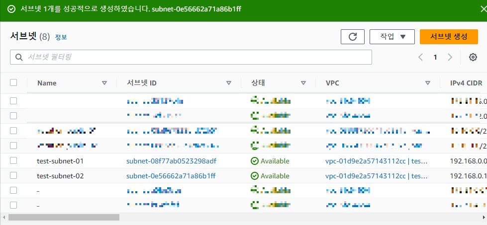 생성 후 필터링된 상태로 서브넷을 보여주는데 필터링을 해제하고 보면