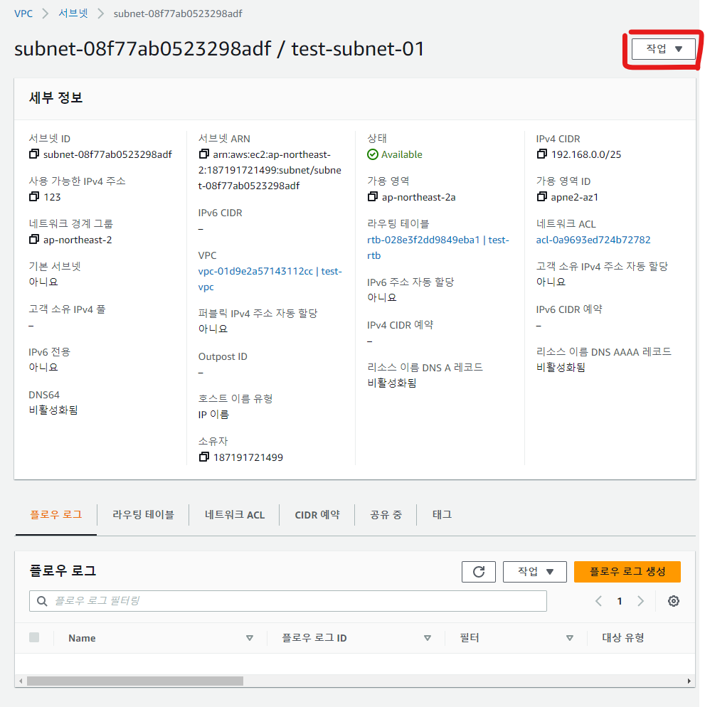 방금 만든 서브넷을 클릭해 상세 페이지로 진입한다