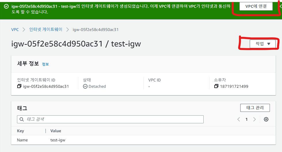 아까 만든 vpc를 선택한 뒤 "인터넷 게이트웨이 연결" 클릭.