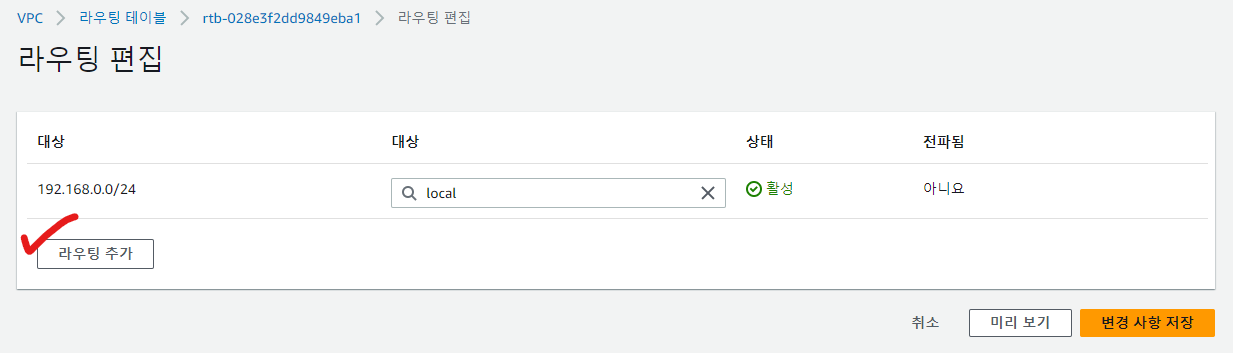 연결 완료가 되었음을 확인한 뒤, 다시 라우팅 테이블 페이지로 돌아가