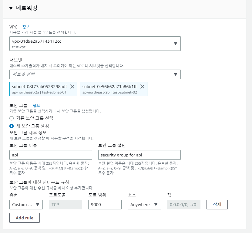 새 보안 그룹을 생성해서 api라 이름 짓고 9000번 포트를 어디서든 접속할 수 있게 허용하도록 한다.