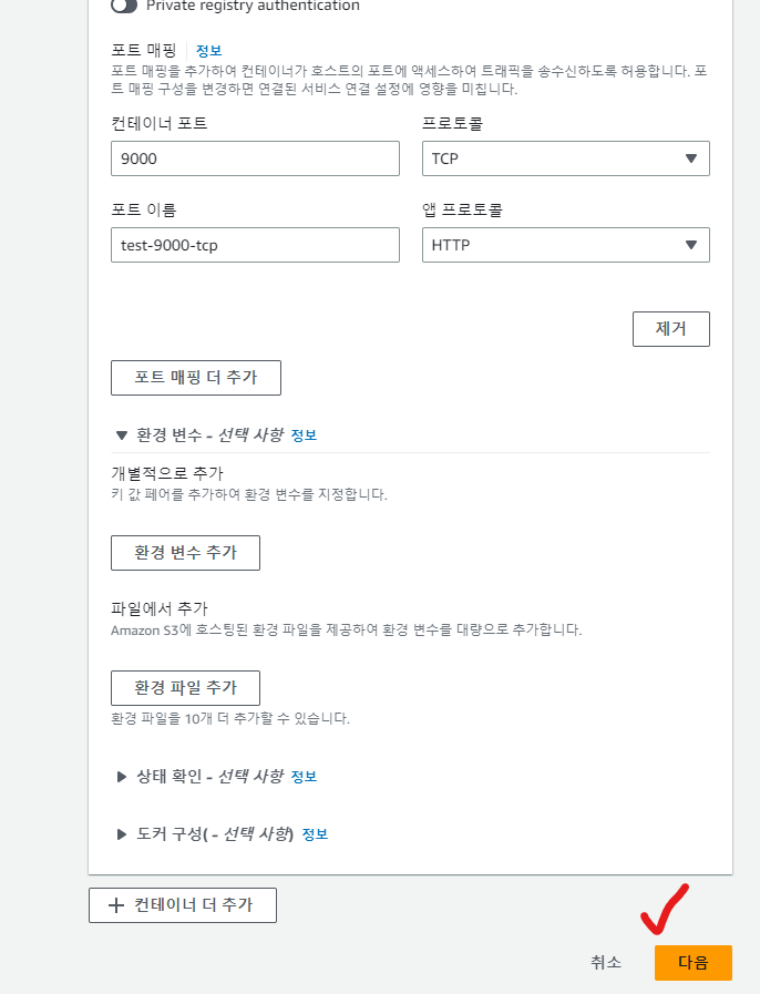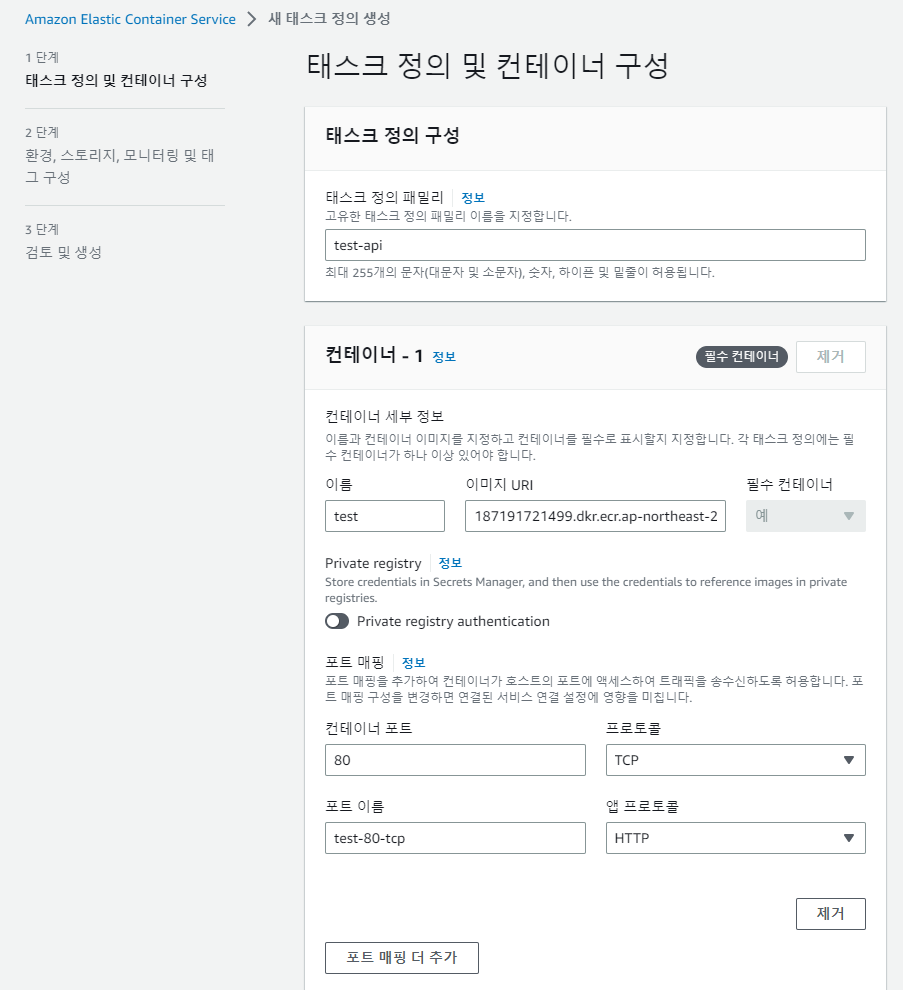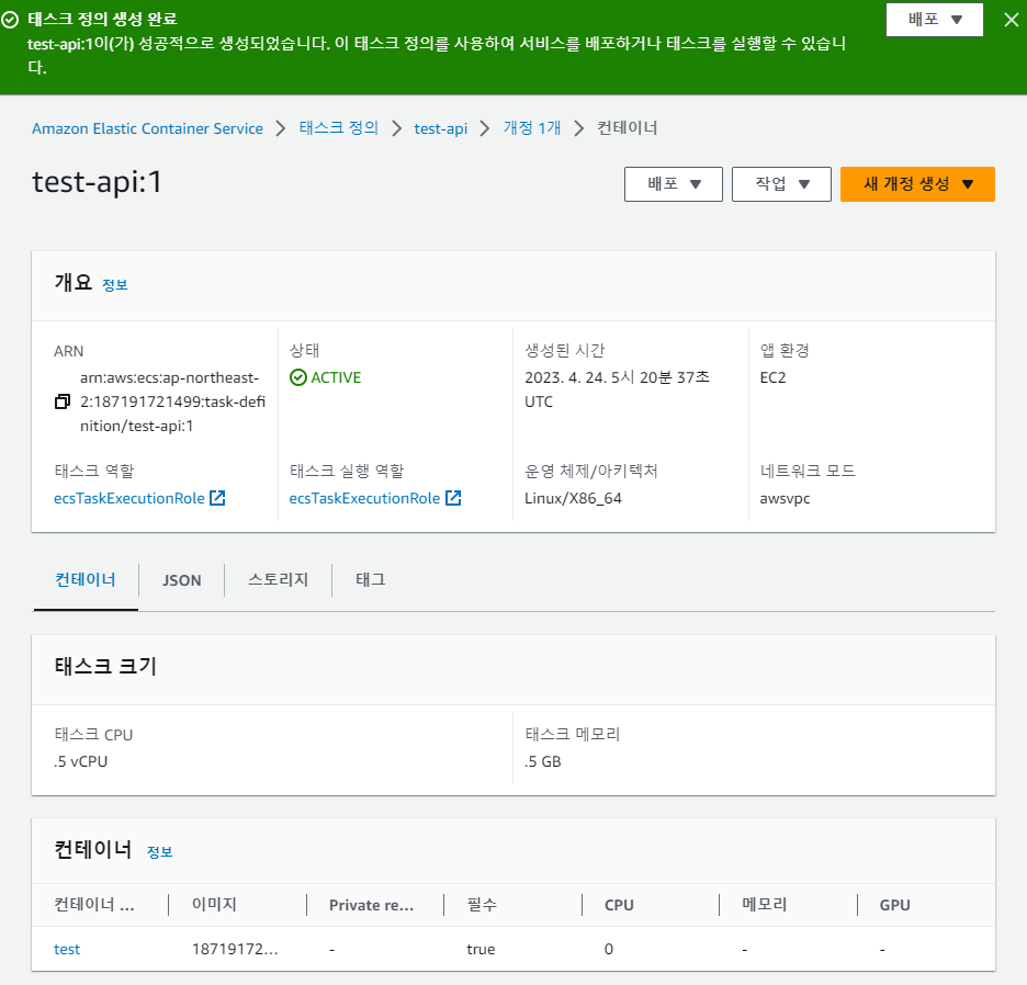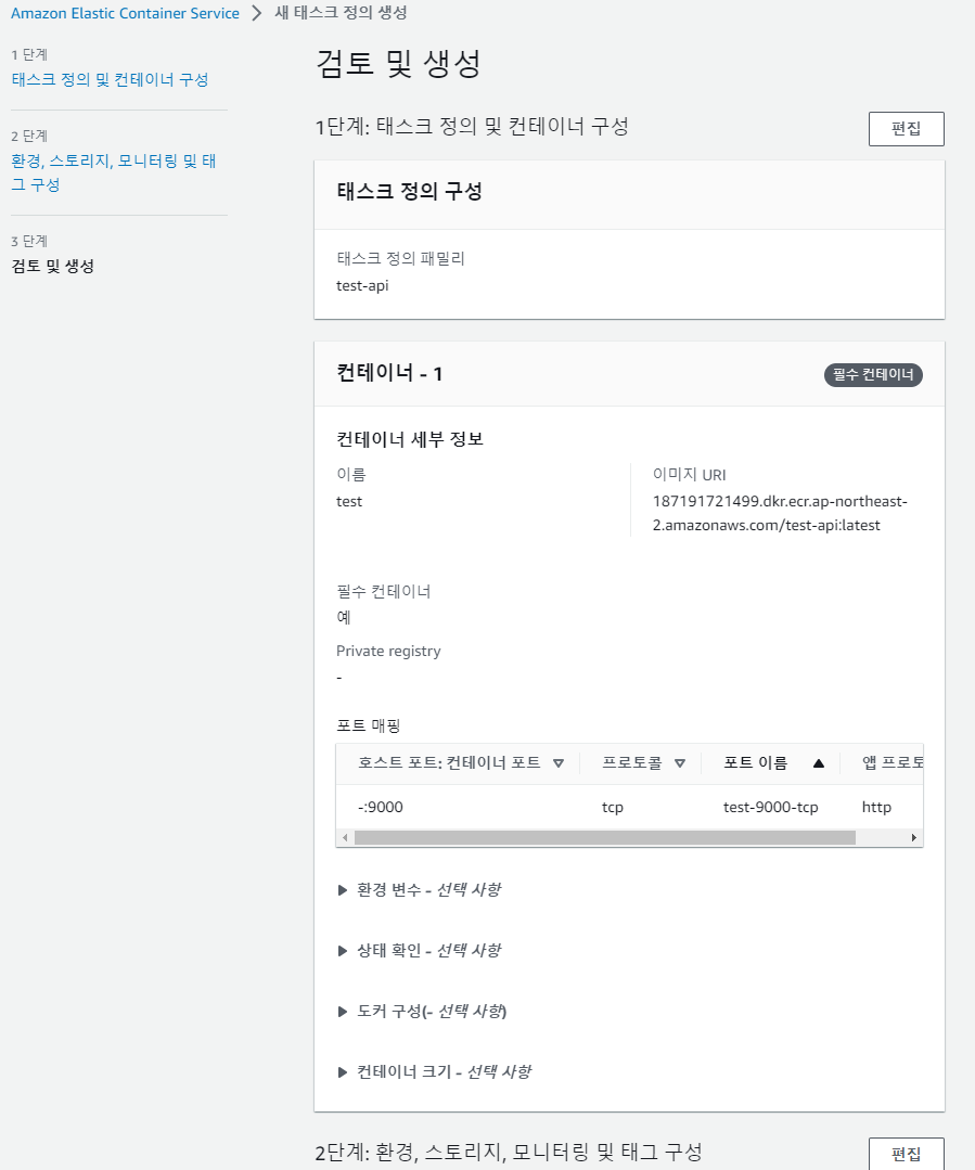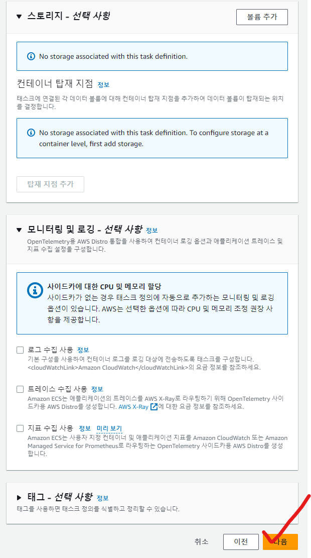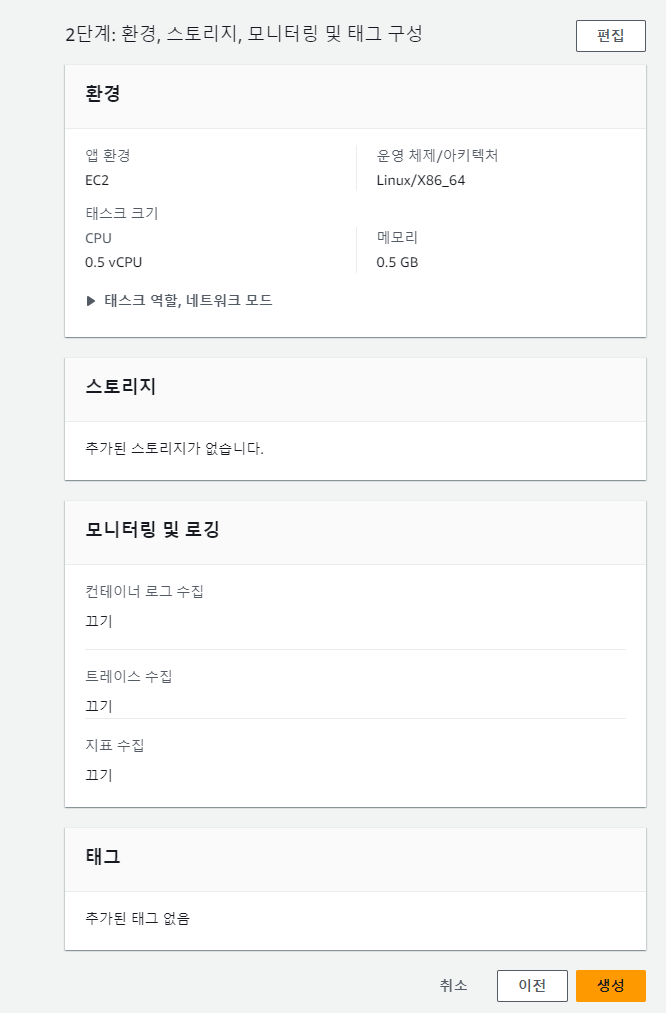 2) 테스크 역할은 만들어서 사용해도 되지만 default인 ecsTaskExecutionRole을 사용해도 좋다.