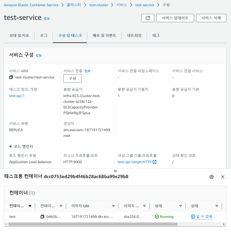 이제 해당 service를 들어가 "구성 및 테스크" 탭에 들어간다