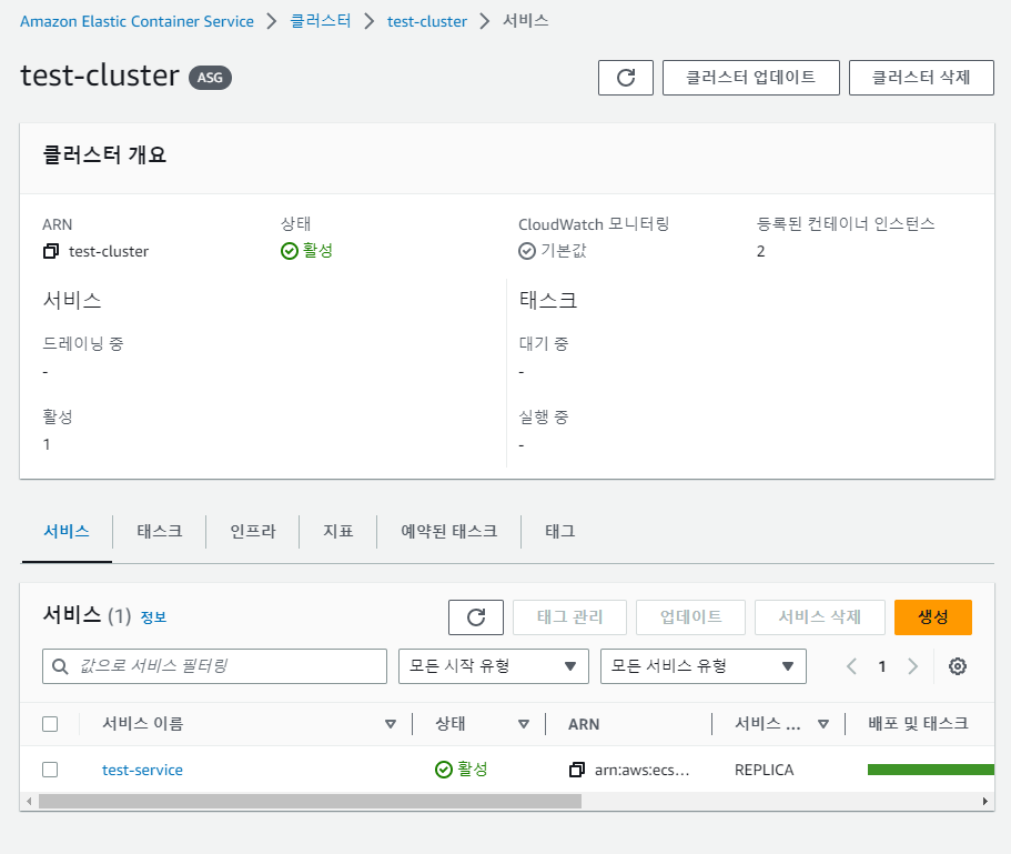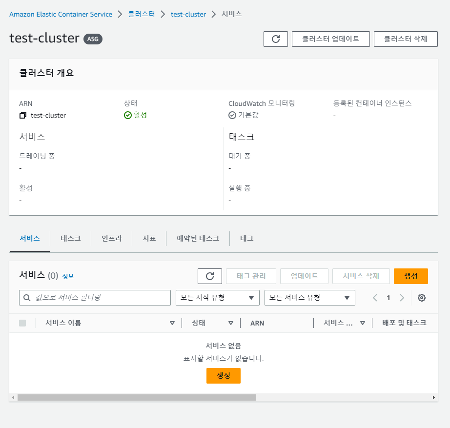 클러스터에 들어와 "서비스" 탭에서 "생성"클릭
