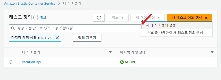 JSON으로 작성하는 것은 자신이 없기에 새 태스크 정의 생성 클릭