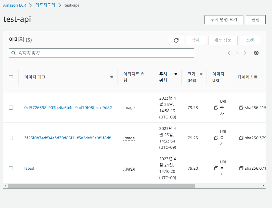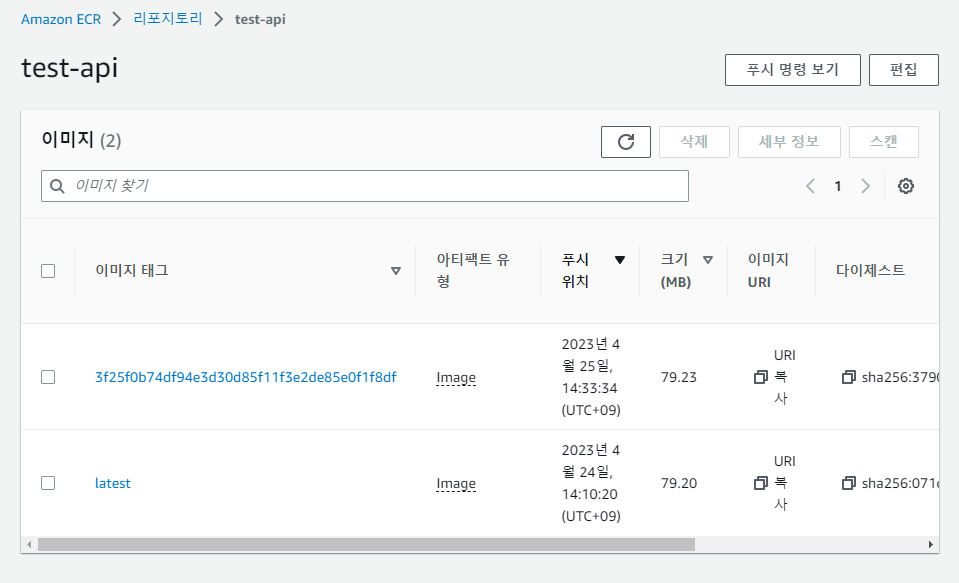 Github에서 정의한 sha string이 태깅된 새로운 이미지가 보인다!
