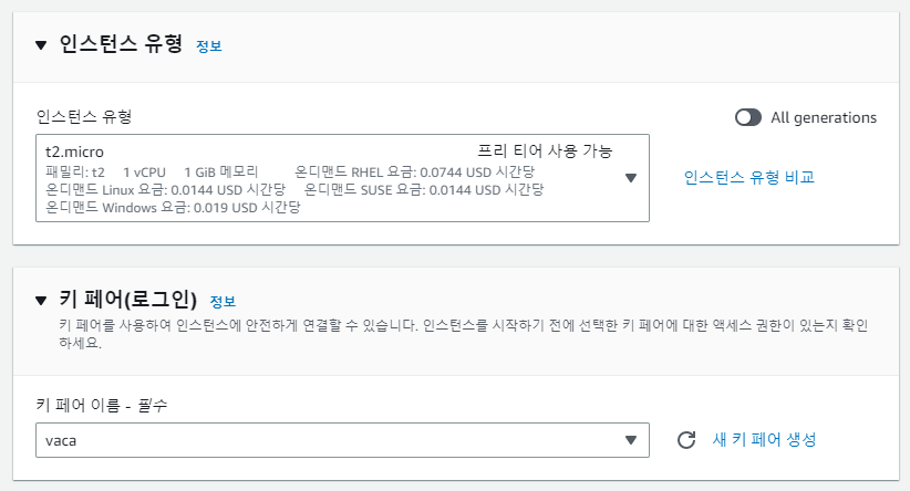 2. 인스턴스 유형을 선택하고, 키페어를 선택한다
