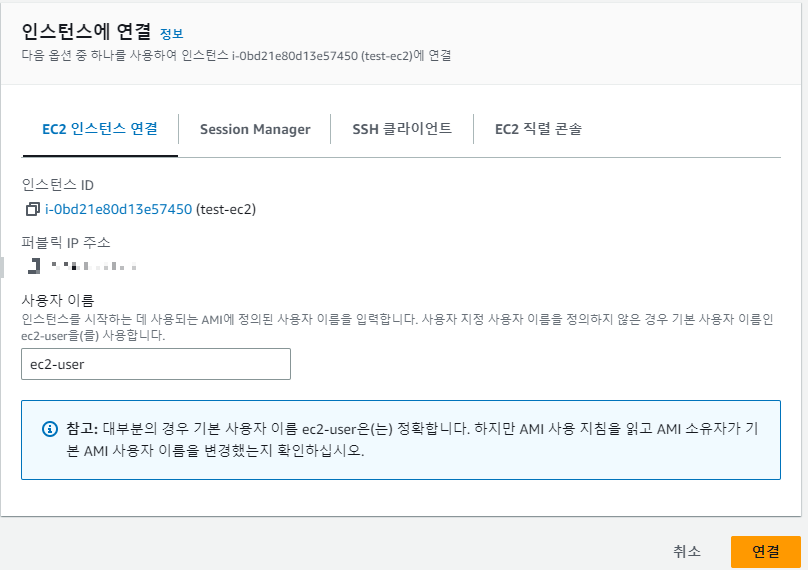 생성된 인스턴스를 확인 및 클릭후 오른쪽 위 새로고침 버튼 옆에 있는 연결을 클릭한다.